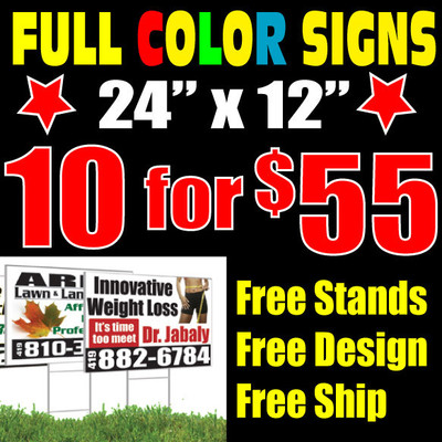 (10) 24x12 Full Color Signs + FREE STANDS + Free Design + Free Ship