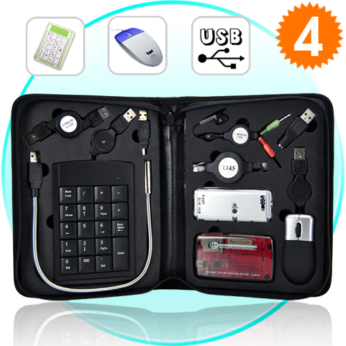 | This convenient tool bag supplies you with everything you need when using your computer on the go. Featuring an    optical mouse, slim 4-port USB hub, USB keypad, inspection light, 8-in-1 card reader and 5 other commonly used cables and adapters, you will always have the most popular connectivity accessories by your side, and without the headache of carrying around large travel bags or messy cables with you.          Unlike most tool bags, the K58 computer tool bag comes in an ultra compact carrying case, making it quick and convenient to bring with you no matter where your travels may take you. In addition, the K58 is constructed from durable premium grade nylon, and features rigid poly-foam placeholders to securely fit every part of this excellent tool bag.            At an unbeatable factory direct wholesale price the CVMW-K58 computer tool bag is the perfect resale item for your    online business or retail storefront. Make a great profit or simply buy one for yourself and give a few away as a great    gift to your friends, relatives or co-workers. The CVMW-K58 computer tool bag is available right now for single    piece or bulk stock orders.  Place your order today and we will ship it out tomorrow!          At a Glance...       Zipper case to conveniently hold all the partsRetractable flex cables for clean wire management Useful for any laptop, netbook, PC or notebook |