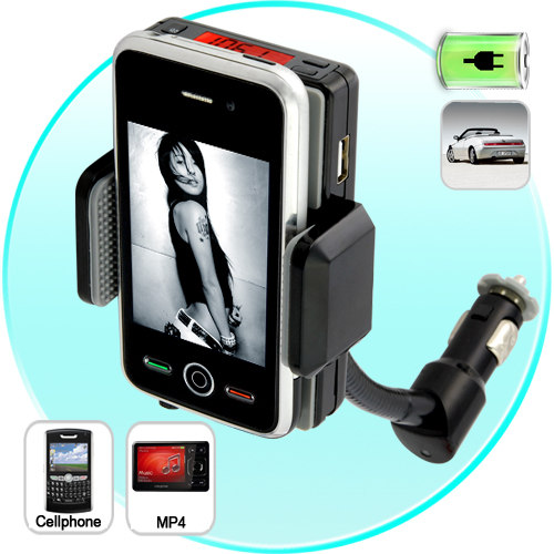 This detachable cellphone & MP6 car charger holder with FM transmitter is the most affordable way to enjoy making the most use of your cell phone or media player in the car. This mobile phone & media player car charger holder with FM transmitter enables you to listen to your music via your cars stereo speakers and charge your mobile phone or media player at the same time. This cellphone & MP3 MP4 car charger holder with FM transmitter is also great for GPS navigators, with its flexible neck and adjustable holder that rotates to 180 degrees, you can place any 3.5 inch GPS navigator directly on to the holder and adjust the holder to suite your preferred viewing angle. This cellphone & media player car charger holder with FM transmitter is suitable for all drivers, designed ergonomically to suite any drivers need with a flexible neck for preferred viewing angle and compatible with any device that is powered by a USB connection at 5V. The great feature about this cell phone & MP6 player car charger and holder with FM transmitter is the FM transmitter function, just adjust the FM frequency from the mobile phone & media player car charger holder with FM transmitter to match that of your car's FM radio frequency, and then enjoy listening to music straight from your cellphone, MP3, MP4, MP5 or MP6 media player. This hands-free cell phone & media player car charger holder with FM transmitter is designed with the user in mind for comfort and easy access of their cell phone and media player functions. This cellphone & media player car charger holder with FM transmitter is in stock now and available at a factory direct wholesale price from the leading providers of consumer factory direct wholesale electronics, Chinavasion. At a Glance... - Built in FM transmitter