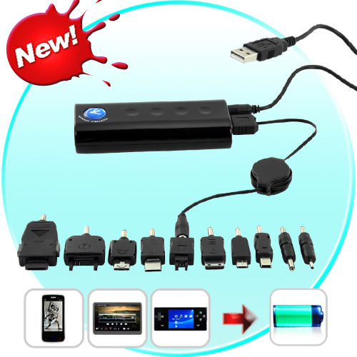 Portable Battery Charger with Power Test (4500mAh) - the most versatile solution for an emergency power source that works with most portable electronics and easily fits in your pocket. Take advantage of the Portable Battery Charger's 4500mAh rechargeable lithium ion battery to enjoy hours of extended play time on your small portable electronic products. The 10 adapter tip are compatible with your cell phone, smart phone, PDA, iPod, MP3 players, portable CD players, Bluetooth headsets, and many others. The Portable Battery Charger is compact and portable and can be used at any time. Put one in your car and leave another at the office so you can recharge all of your electronic devices when you need it the most. Also included is a power test button and 4 LED indicators that will show you the amount of power left in the Portable Battery Charger. When it's low, all you have to do is connect the USB cable and charge it back to full again. With this one Portable Battery Charger, you get an unbeatable low-priced emergency power source for almost all of your portable electronics. Available in our warehouse now, order today and we'll express ship it out tomorrow. Brought to you by the leader in China Electronics - Chinavasion. At a Glance... - 4500mAh Portable Battery Charger