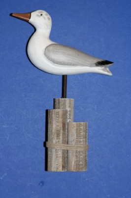 THIS HANDSOME SEAGULL IS CARVED FROM WOOD AND IS PERCHED ATOP ROPED PILINGS. HE IS BEAUTIFULLY PAINTED WITH NATURAL LOOKING COLORS AND HIS EYES ARE EMBEDDED GLASS BEADS GIVING HIM GREAT PERSONALITY. THE PERFECT GIFT FOR THE BEACH LOVER OR BIRD WATCHER.