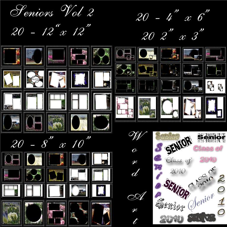 In this auction you will receive templates that are perfect for Seniors. You will receive 2 full DVD's filled with Announcements, Backgrounds, Frames, 2 - Alphabet sets, and 1-8X10 word art Everything you need to create an updated Urban or Grunge look for seniors. Buy bundles and save. All created at 300 dpi. Mix and Match!!! for a great new look!!!