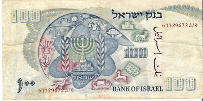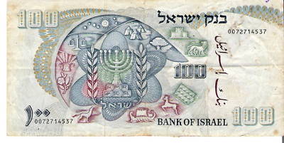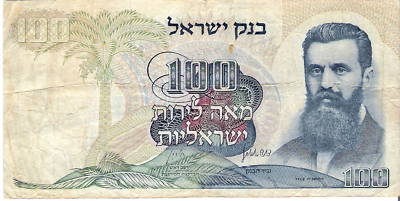 You are bidding on Israeli 100 Lirot issued in 1968. The father of modern political Zionism Dr. Theodor Herzl on front. Menoraand symbols of the 12 tribes of Israelon back. There is a scotch tape stuck from the lower edge to the upper corner of the banknote. Fine condition.