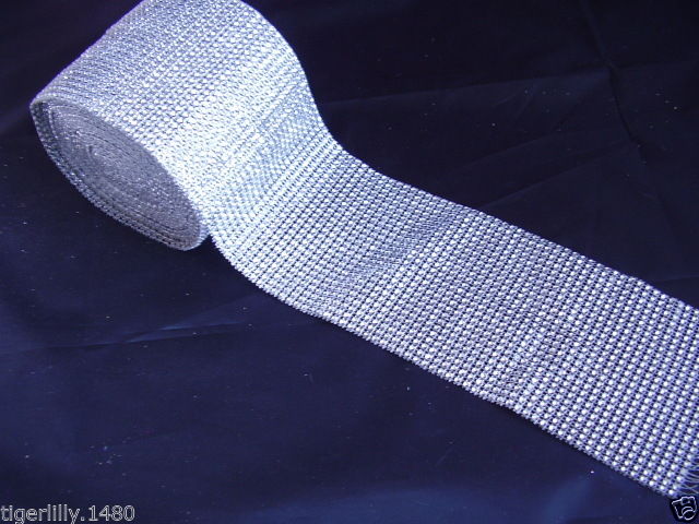 24 Row Diamante effect Ribbon Wrap 24 row Diamante( @12cm/5inches) effect Ribbon wrap Sold by metre or by 9 metre roll. This Diamante wrap is Brilliant for trimming wedding cakes, Bouquet's & arrangement's, invitations, card's as well as table runner's, candelabra's & most other craft's as wrap is easy to cut, bend, stick and is very bendable. When buying more than 1 metre I will provide in continuous lengths up to 9metre's. Brilliant versatile accessory, also great for decorating costume's, hat's etc tigerlillybutterfliesweddingaccessories.co.uk