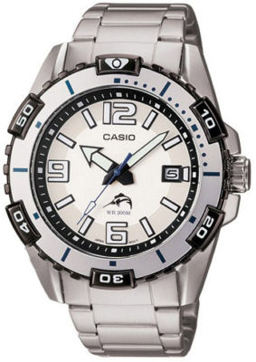 Stainless steel case and bracelet. Unidirectional bezel. The dial is silver and analog - 3 hands (hour, minute, second) and date display, Accurate to �20 seconds per month. Quartz movement. Case dimensions: 50.0 mm x 43.8 mm. Case thickness: 12.0 mm. Double fold with push button release Clasp. Water resistant to 200 meters / 660 feet. Long -life battery. Casio Duro Watch MDV105D-7AVDF | |