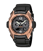 Resin & stainless steel case with a black rubber bracelet. Fixed copper-tone bezel. Brown dial with luminous hands stick hour markers. Arabic numerals mark the 6 and 12 o'clock positions. Minute markers around the outer rim. Full auto calendar up to year 2099. Polar movement. Scratch resistant mineral crystal. Case dimensions: 47.0 mm x 46.9 mm. Case thickness: 15.8mm. Tang clasp. Water resistant at 200 meters / 660 feet. Functions: hours, minutes, seconds, date, stopwatch, backlight, afterglow, solar powered, world time, 12/24 hour formats, countdown timer, daily alarms, battery power indicator. Casio G-Shock Hybrid Solar Powered Mens Watch G1500B-5A. | |