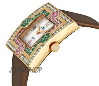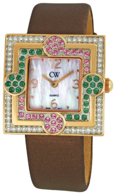 Crystal encrusted gold-tone stainless steel case with a brown satin bracelet. Fixed bezel. Pink mother of pearl dial with gold-tone hands and dot hour markers. Arabic numerals mark the 3, 6, 9, and 12 o'clock position. Quartz movement. Solid case back. Case dimensions: 34 mm x 34 mm. Case thickness: 8.5 mm. Tang clasp. Water resistant at 30 meters/ 100 feet. Functions: hours, minutes. Charles Winston Pink Mother of Pearl Dial Brown Satin Strap Ladies Watch WR0292-PK. | |