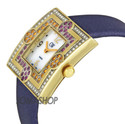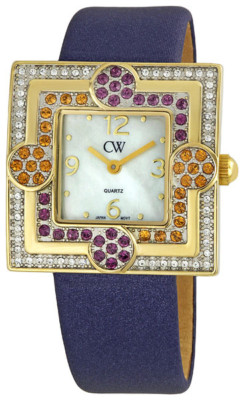 Crystal encrusted gold-tone stainless steel case with a blue satin bracelet. Fixed bezel. Mother of pearl dial with gold-tone hands and dot hour markers. Arabic numerals mark the 3, 6, 9, and 12 o'clock position. Quartz movement. Solid case back. Case diameter: 34 mm x 34 mm. Case thickness: 8.5 mm. Tang clasp. Water resistant at 30 meters/ 100 feet. Functions: hours, minutes. Charles Winston White Mother of Pearl Dial Blue Satin Strap Ladies Watch WG0292-PR. | |