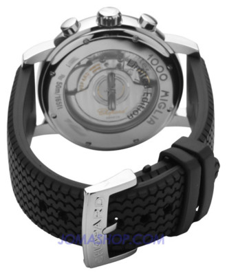 Stainless steel case with a rubber with dunlop thread bracelet. Stainless steel bezel. Ruthenium dial with luminous hands and lumious Arabic numerals hour markers. Luminiscent hands. Date displays between the 4 and 5 o'clock position. 3 black subdials. Automatic movement. Scratch resistant sapphire crystal. Stainless steel with mm logo (7mm), fluted crown. Sapphire crystal display case back. Case diameter: 42.0mm. Case thickness: 12.31mm. Tang clasp. Water resistant at 50m / 165ft. Chopard Mille Miglia Grey Dial Watch 168511-3002. | |