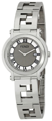 Stainless steel case with a stainless steel bracelet. Fixed stainless steel bezel. Gray with silver dial with silver-tone hands and Roman numeral hour markers. Date displays at the 3 o'clock position. Quartz movement. Scratch resistant sapphire crystal. Case diameter: 38 mm. Case thickness: 8 mm. Push button deployant clasp. Water resistant at 30 meters / 100 feet. Functions: hours, minutes, date. AdditionalInfo: luminous hands and hour maker. date display at 3.roman numerals.. Fendi Quadro Mens Watch 615160. | |