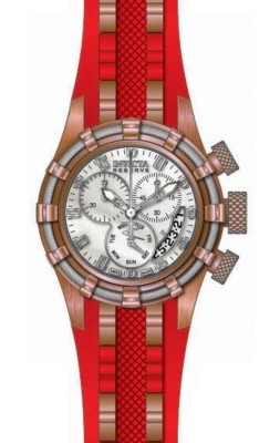 Stainless steel case with a red polyurethane rubber bracelet with 18kt rose gold-tone links. Fixed cable wire bezel secured by small prongs. Mother of pearl dial with luminous skeletal silver-tone hands and index hour markers. Minute markers around the outer rim. Date display at the 4 o'clock position. Three sub-dials displaying: 60 seconds, 30 minutes and the day of the week. Swiss quartz chronograph movement. Scratch resistant flame fusion crystal. Screw down crown with function pushers. Screw down case back. Case diameter: 40 mm. Case thickness: 14 mm. Tang clasp. Water resistant at 200 meters / 660 feet. Invicta Ladies Reserve Bolt Chronograph Watch with Red Polyurethane Bracelet 6952 | |