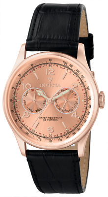 Stainless steel case with a brown croco-embossed leather bracelet. Fixed bezel. Rose gold dial with luminous gold-tone hands and alternating stick and Arabic numeral hour markers. Chronograph - two sub-dials displaying day and date. Swiss quartz movement. Scratch resistant flame fusion crystal. Case diameter: 44 mm. Tang clasp. Water resistant at 50 meters / 165 feet. Invicta Mens Vintage Collection Watch 6750. | |