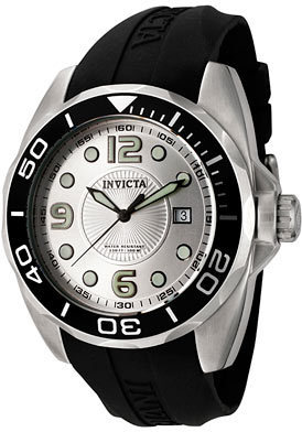 Stainless steel case with a black rubber bracelet. Unidirectional bezel. Silver dial with luminous hands and dot hour markers. Minute markers around the outer rim. Date displays at the 3 o'clock position. Quartz movement. Scratch resistant flame fusion crystal. Case diameter: 45 mm. Case thickness: 14 mm. Tang clasp. Water resistant at 100 meters/ 330 feet. Functions: hours, minutes, seconds, date. Invicta Pro Diver Mens Watch IN0424. | |