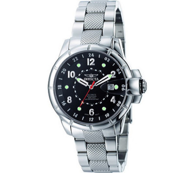 Stainless steel case with a stainless steel link bracelet. Fixed stainless steel bezel. Black dial with luminous hands and alternating Arabic numeral and dot hour markers. GMT scale around the outer rim. Luminiscent hands and markers. Date display at the 3 o'clock position. Automatic movement. Scratch resistant mineral crystal. Screw down crown. Skeleton case back. Case diameter: 43mm. Deployment clasp. Water resistant at 200 meters / 660 feet. AdditionalInfo: date display at 3 o'clock. Invicta Prowler Automatic Mens Watch 7171. | |