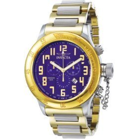 Stainless steel case with a two-tone (silver and gold-tone) stainless steel bracelet. Unidirectional gold-tone bezel. Blue dial with luminous hands and Arabic numeral hour markers. Tachymeter around the inner bezel. Luminiscent hands and markers. Date display between the 4 ans 5 o'clock positio. Chronograph - three sub-dials displaying: 60 seconds, 30 minutes and 1/10th of a second. Quartz movement. Scratch resistant mineral crystal. Solid case back. Case diameter: 52 mm. Deployment clasp. Water resistant at 200 meters / 660 feet. Invicta Russian Diver Offshore Chronograph Mens Watch 4160. | |
