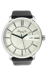 Stainless steel case with a black leather bracelet. Fixed stainless steel bezel. White dial with luminous black hands and stick hour markers. Minute markers around an inner ring. Luminiscent hands. Date display appears at the 3 o'clock position. Quartz movement. Scratch resistant mineral crystal. Steel crown. Solid case back. Case diameter: 39 mm. Case thickness: 9 mm. Tang clasp. Water resistant at 30 meters / 100 feet. Kenneth Cole New York Analog Quartz Mens Watch. | |