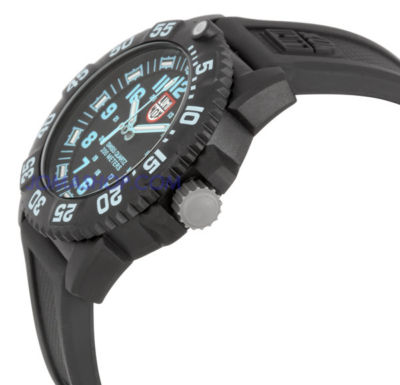 Carbon reinforced case with a black resin bracelet. Undirectional bezel. Black dial with luminous blue hands and Arabic hour markers. GMT scale on inner ring. Luminiscent hands and dial markers. Date displays at the 3 o'clock position. Quartz movement. Scratch resistant mineral crystal. Case diameter: 38 mm. Case thickness: 12 mm. Tang clasp. Water resistant at 200 meters (660 feet). Functions: hours, minutes, seconds, date, GMT. Luminox EVO Colormark Ladies Watch 7053. | |