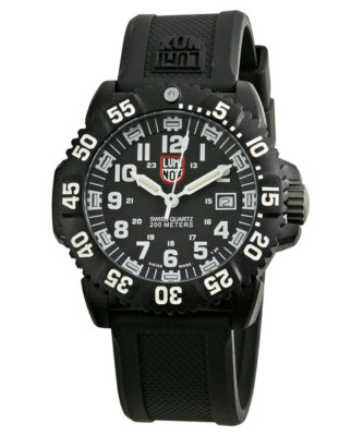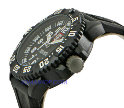 Black carbon-reinforced polymer case with a black rubber bracelet. Unidirectional rotating bezel. Black dial with luminous hands and Arabic numeral hour markers. Minute markers around the outer rim. GMT scale on inner ring. Luminiscent hands and dial markers. Date displays at the 3 o'clock position. Quartz movement. Scratch resistant mineral crystal. Case diameter: 44 mm. Case thickness: 14 mm. Tang clasp. Water resistant at 200 meters / 660 feet. Functions: hours, minutes, seconds, date, GMT. Luminox Evo Navy Seal Mens Watch 3051. | |