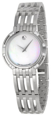 Stainless steel case with a stainless steel bracelet. 12 floating diamonds bezel. White mother-of-pearl dial. Quartz movement. Scratch resistant scratch resistant sapphire crystal. Case diameter: 28mm. Case thickness: 6mm. Jewelry clasp. Water resistant at 30m/100ft. Additional Info: 605389, 0605389. Movado Esperanza Diamond Midsize Watch 0605389. | |