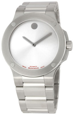 Stainless steel case with a stainless steel bracelet. Fixed stainless steel bezel. Silver dial with silver-tone hands. Luminiscent movado 'dot' appears at the 12 o'clock position. Automatic movement. Scratch resistant sapphire crystal. Fluted crown. Skeletal case back. Case diameter: 44 mm. Case thickness: 10.3 mm. Deployment with push button release clasp. Water resistant at 30 meters / 100 feet. Movado Mens SE Extreme Stainless Steel Bracelet Watch 0606291. | |