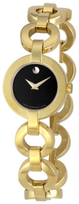 Gold plated stainless steel case with a gold plated stainless steel bangle bracelet. Fixed gold-tone stainless steel bezel. Black museum dial with gold-tone hands. No markers. The signature Movado 'dot' appears at the 12 o'clock position. Swiss quartz movement. Scratch resistant sapphire crystal. Push in crown. Solid case back. Case diameter: 24.5 mm. Case thickness: 5.5 mm. Jewelry clasp. Water resistant at 30 meters / 100 feet. Movado Womens Bela Moda Gold-tone Steel Bangle Bracelet Watch 0606262. | |