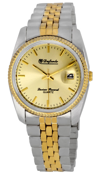 Stainless steel case with a two-tone (silver and gold) stainless steel bracelet. Fixed two-tone bezel. Gold dial with gold-tone hands and stick hour markers. Minute markers around the outer rim. Date display at the 3 o'clock position. Quartz movement. Solid stainless steel case back. Case diameter: 36 mm. Case thickness: 10 mm. Fold over clasp. Lifetime Manufacturer Warranty. Dufonte by Lucien Piccard Mens Classic Executive Watch 81129. | |