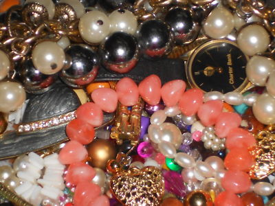 Junk Jewelry Lots can include one or more whole or pieces of; necklaces, single or pairs of earrings, lapel pins, bracelets, chains , charms, key chains, belt buckles, barrettes, brooches, pins, buttons, hair accessories, fashion watches and more. Every Jewelry lot is a mixture...and is unique and different from any other lot we might list.This is a real treasure chest of fun pieces.