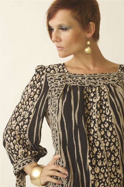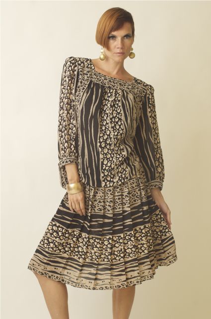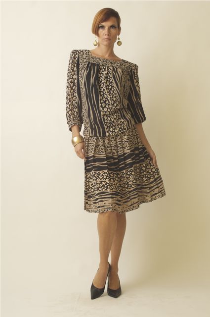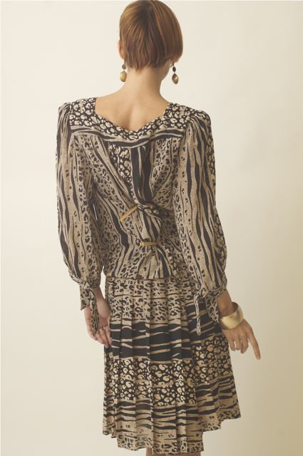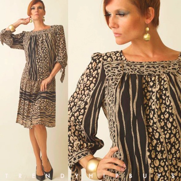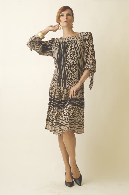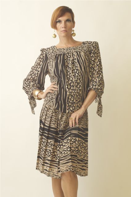This was pinned on model to fit her. It is much larger on the model. Square neckline with 3/4 sleeves with bow to tie at cuffs. Drop waistline with mini pleated skirt. Sheer abstract safari like print. Dress is lined through out. Great for Spring or summer for all occasions! :)