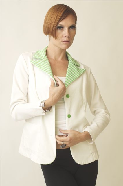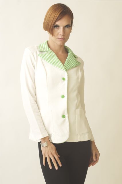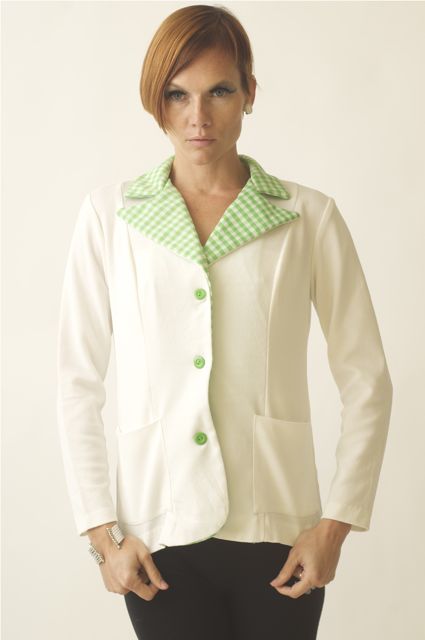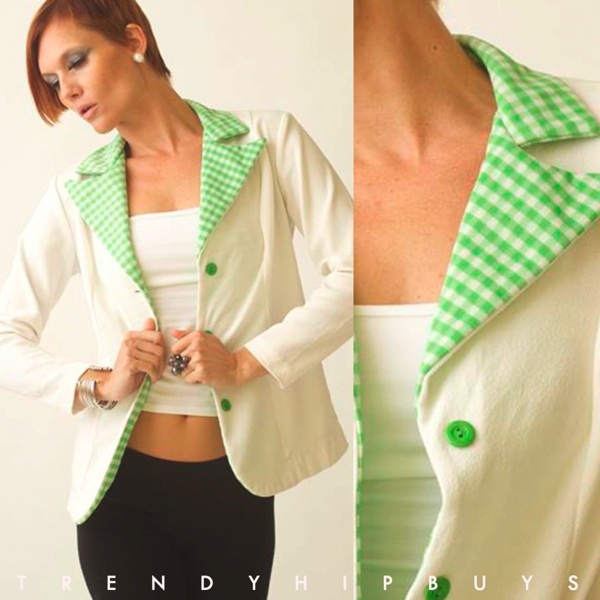 Very cute open folded shirt green gingham collar. Front buttons. Long sleeves. Great with skinny Jeans, cropped pants with boots or heels. perfect for work or any fun occasion. Very unique jacket! WOW!
