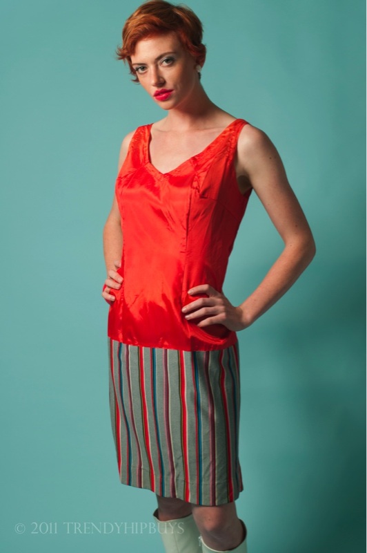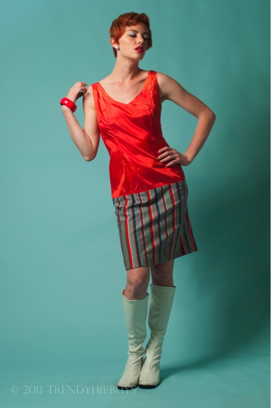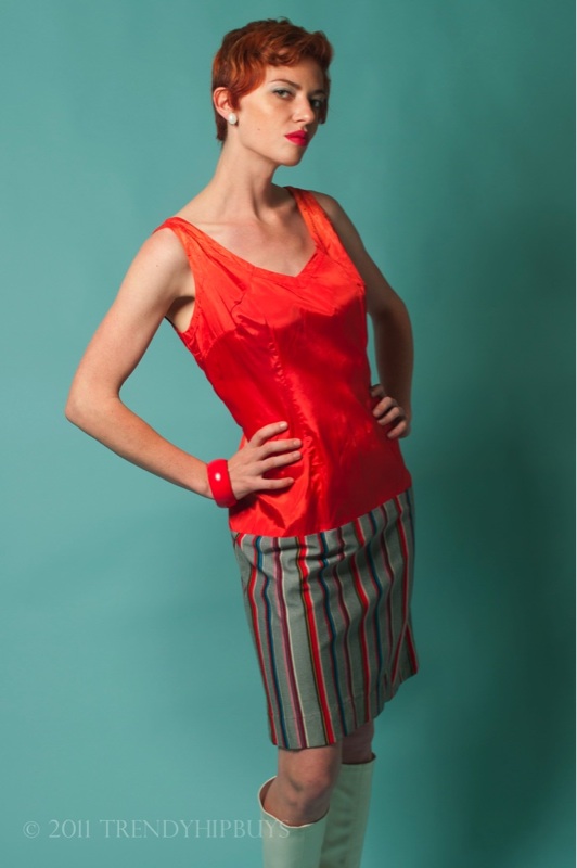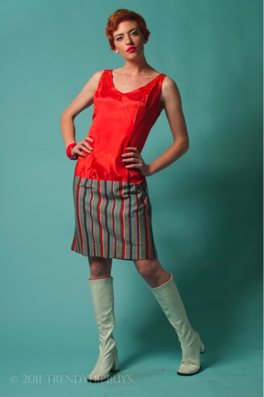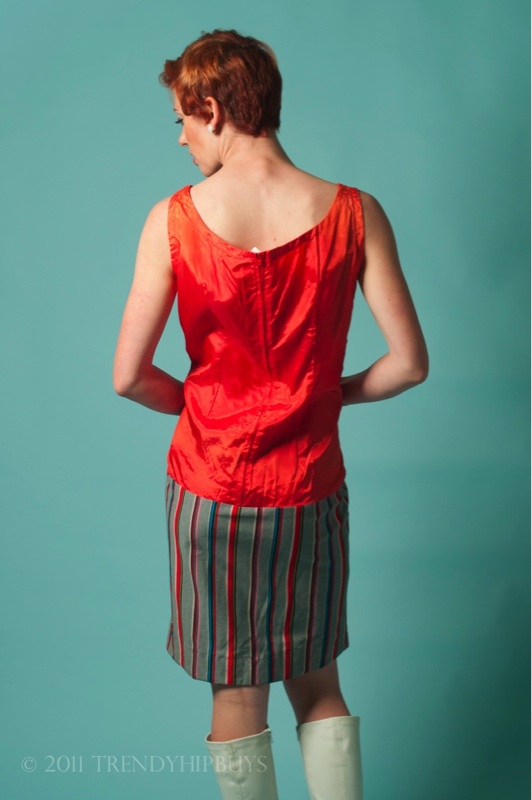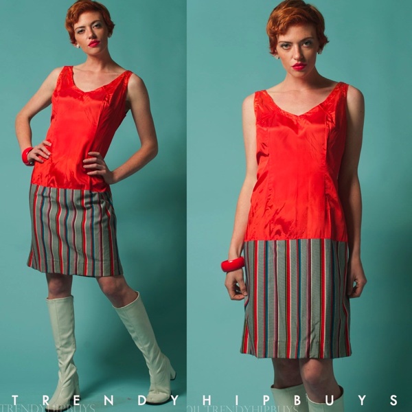 Scoop neckline. Sleevless. Zipper in the back. waistline with cute mod stripe mini skirt. Cute with tall white boots. Super retro, super cool! A great piece for any fun parties!!! WOWW!