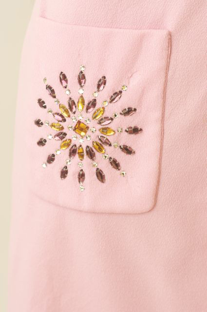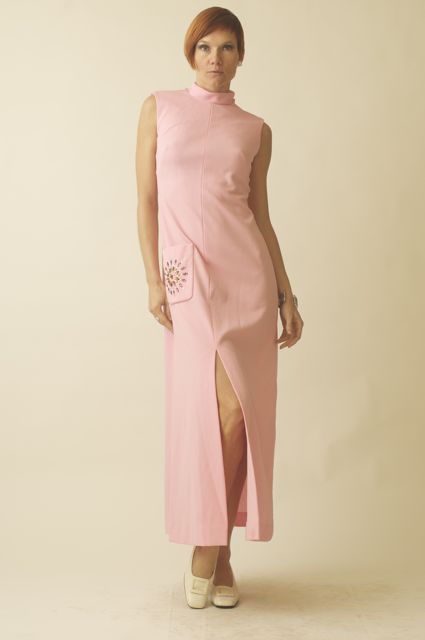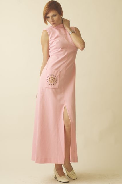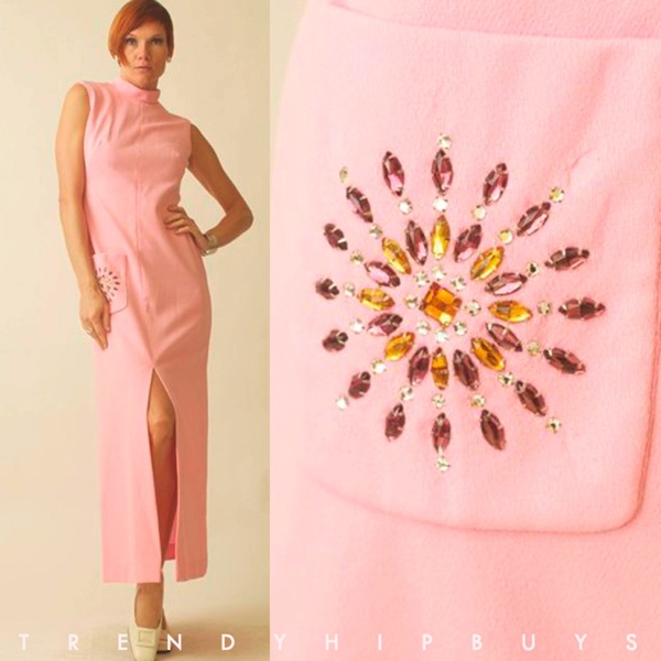 When bought, 4 rhinestone beads were missing but the design still looks great as photographed. Sleeveless with high collar neckline. Pencil style long skirt with front sexy slit. Pocket on right hip with beautiful jewel rhinestones. Zipper on the back. Great for weddings or any formal gathering. WOW! :)