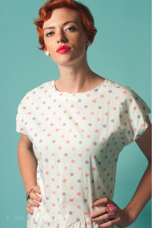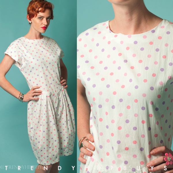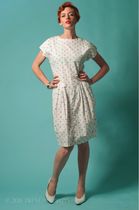Jewel neckline with cap sleeves. Zipper on the back. Drop waistline with gathers. Pencil style short skirt. Cutest pink purple polka dot print on white cotton like material. Perfect for Spring or Summer!!! ;)