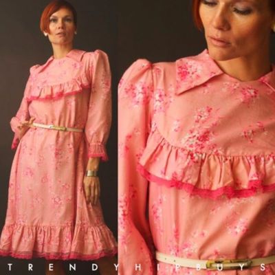 Pointed shirt collar with long sleeves. Loose elastic cuffs with lace trim. Zipper in the back. Ruffle across chest. Tent style bodice but belt should be worn to create a waistline. A-line skirt with flounce and lace at hem. Beautiful floral print in romantic print. Great for any occasions. WOW!