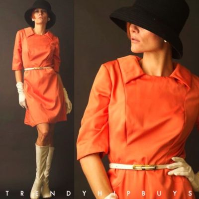 Small open wing pan collar with zipper in the back. 60s thin shoulder pads. Classic 3/4 sleeves. Beautiful princess style bodice with A-line skirt. Romantic peach sherbet orange color. Great with heels of boots. Elegant and stylish, a real collectible piece from the 60s. WOW!