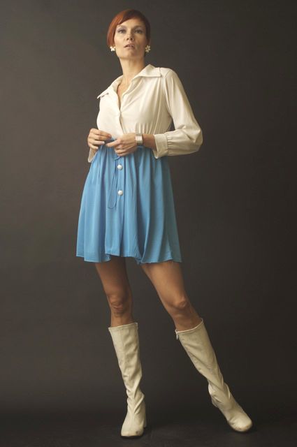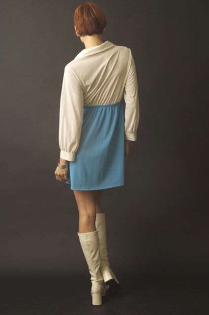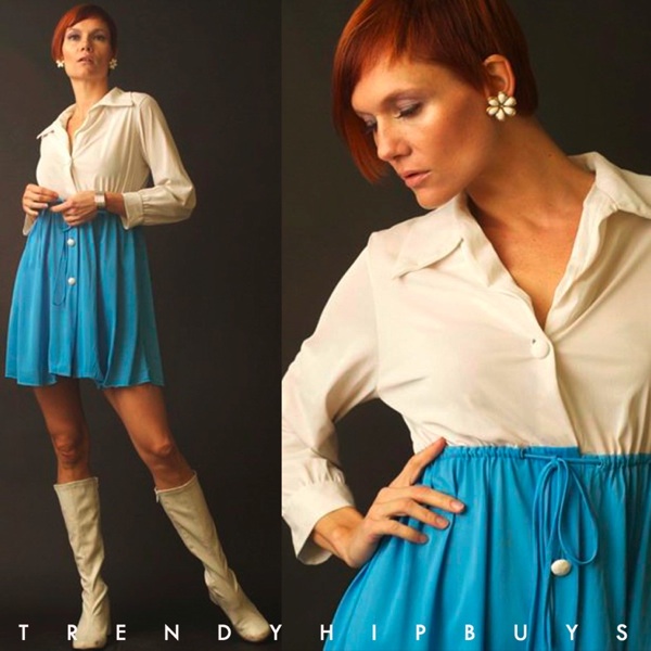 The original was missing buttons on the skirt. New vintage white buttons were added on. Shirt collar with long cuff sleeves. Front buttons. Thin material, probably best if worn with slip. Empire waistline with draw string belt so you can tighten as much or as little as you like. Mini turquoise A-line skirt. Super adorable and sexy! Wear it with tall white boots, you will turn heads! A great piece for the Spring or Summer! WOW :)