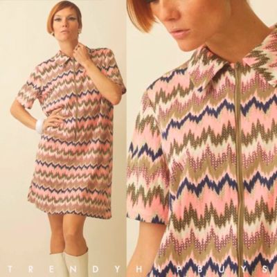Pointed shirt collar with front zipper. Short sleeves with tent style bodice. A-line mini skirt. Zig Zag space Age Mod Print. Great for any fun occasion. Super funky, Mod and fun! Perfect for any fun parties! Imagine wearing this with wide headbands and big sunglasses, WOW! :)