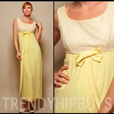 VTG 60s TWIGGY Yellow LACE Top Evening MAXI Dress S/M24