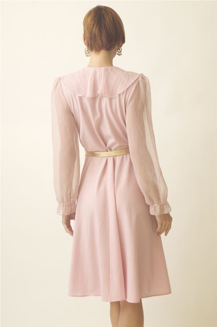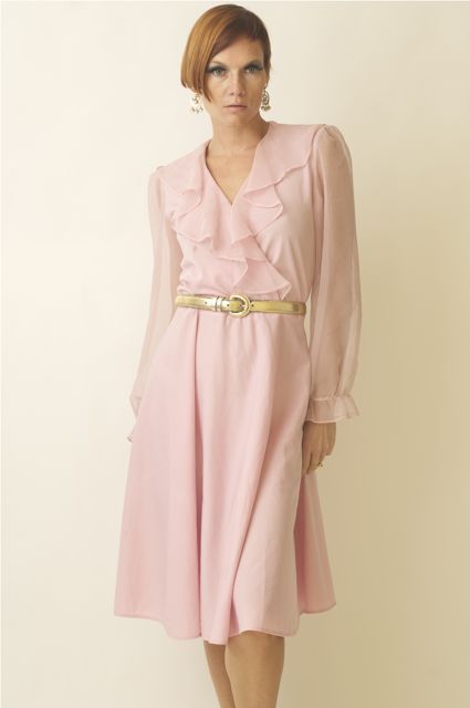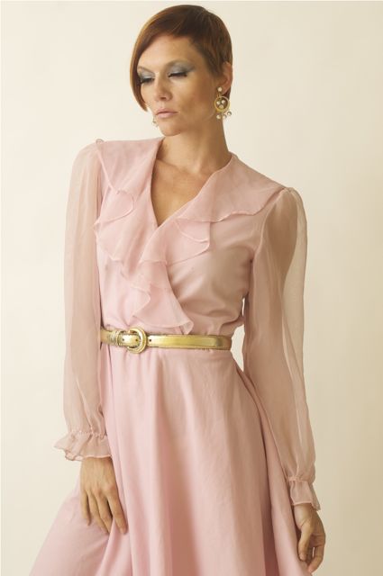 Beautiful sheer ruffle top with V-neckline. Long sleeves with flounce (loose elastic). Loose elastic waistline due to age. A-line flowing skirt. Super romantic and cute! Great for all occasions even weddings and dates, very Carrie Bradshaw! in sweet pink color! WOW!