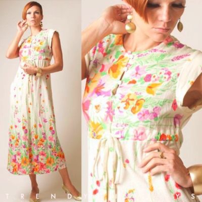 Jewel Collar with Cap Sleeves. Front buttons with zipper from waist down. Mini string bow to tie at elastic empire waistline. Long A-line skirt. Material has texture that like soft towel like material. Beautiful romantic flower print on off white material. Great for Spring :)!