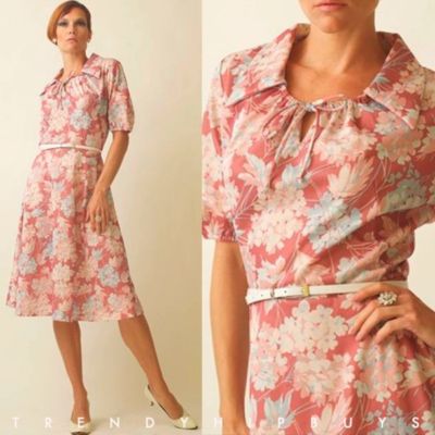 Draw string shirt collar with bow to tie at neckline. Puff sleeves with elastic. A-line skirt. Beautiful pink blue flower print. Very feminine and romantic. Great for a date or any fun Spring or Summer parties! WOW! :)