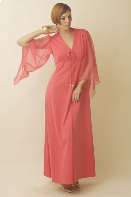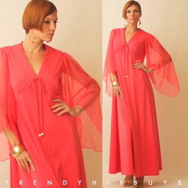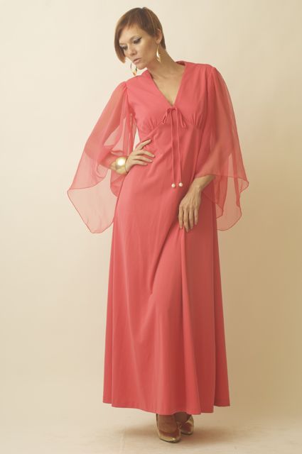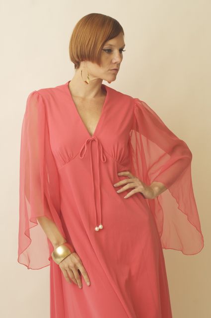 A vintage 70s boho chic maxi empire waist dress. V-neckline with bow to tie with plastic pearl like beads attached at each end. Llarge sheer bell sleeves. Zipper in the back.