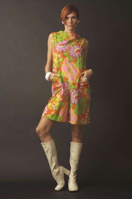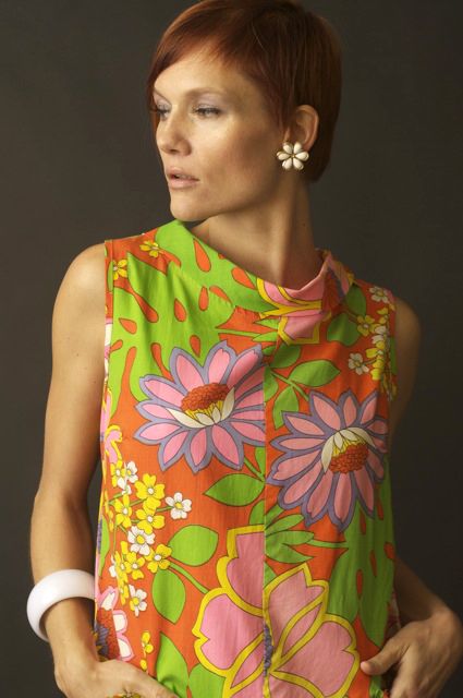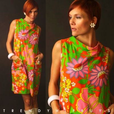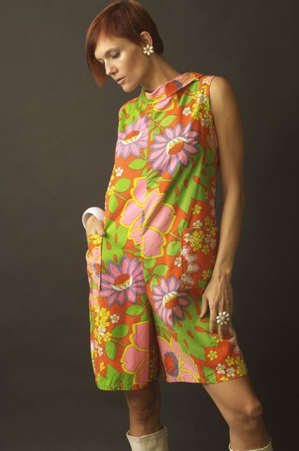Folded high collar neckline with metal zipper in the back. Sleeveless. Pockets on lower hip. A-line bodice with shorts. Perfect with tall boots, ankle boots, flats, or heels. Anything goes! Just put on that large sunglasses and wrap your hair with a scarf, you are all set :)! WOW!!! A super cute retro pink/green/orange multi-color and vibrant piece with large abstract flower power print! Just Amazing! :)