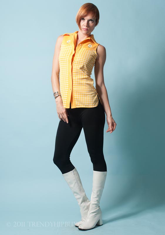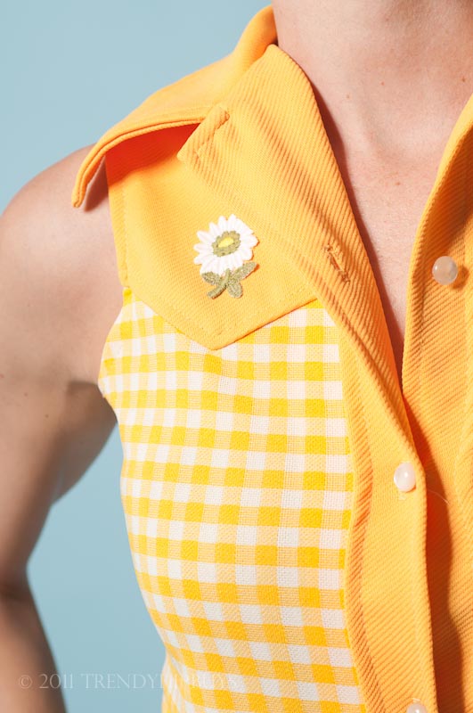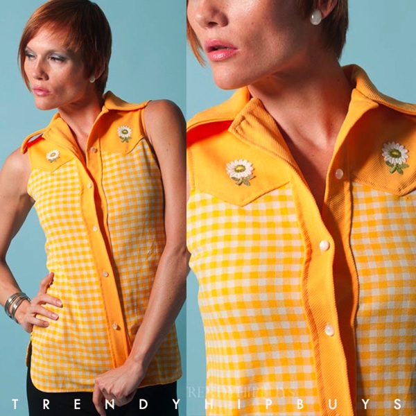 Pointed bat wing collar. Front buttons. Cute flower patches detailing below shoulders. Gingham print. In adorable yellow. A great classic top wears well with skinny Jeans, white pants or mini skirt with boots or espadrilles. WOWW! Super cute! A rare piece! :)