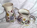Item 2 is 4 jugs of different shape and sizes one tall one 5.5" high one med stump one witch is 3" high 1 small one 2 " high 3 of them have the flower patten and one has The Warehose .Poole on the front with a ship