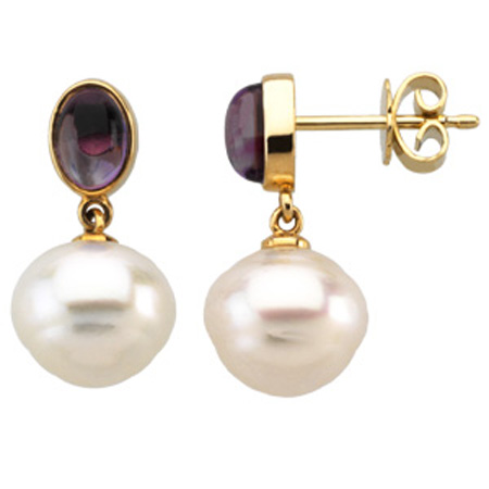 These are a appealing pair of south sea cultured pearl and genuine amethyst earrings. The earrings feature two baroque white cultured South Sea Pearls that are 6.0MM in diameter. The earrings also contain two natural oval purple amethyst that is bezel set in solid 14K yellow gold. These earrings securely fit to your ear with a post with friction back.