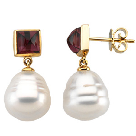 These are a classy pair of south sea cultured pearl and genuine rhodolite garnet earrings. The earrings feature two baroque white cultured South Sea Pearls that are 6.0MM in diameter. The earrings also contain two natural square shape red rhodolite that is bezel set in solid 14K yellow gold. These earrings securely fit to your ear with a post with friction back.