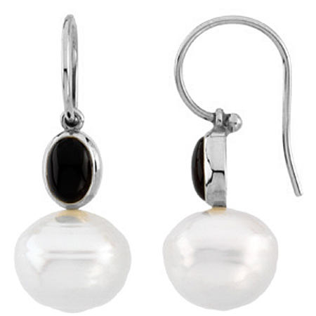 These are a graceful pair of south sea cultured pearl and genuine onyx earrings. The earrings feature two baroque white cultured South Sea Pearls that are 6.0MM in diameter. The earrings also contain two natural oval black onyx that is bezel set in solid 14K white gold. These earrings securely fit to your ear with a french wire.