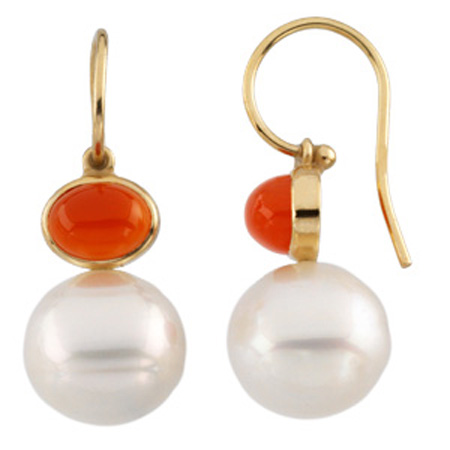 These are a glamorous pair of south sea cultured pearl and genuine carnelian earrings. The earrings feature two baroque white cultured South Sea Pearls that are 5.0MM in diameter. The earrings also contain two natural oval orange carnelian that is bezel set in solid 14K yellow gold. These earrings securely fit to your ear with a french wire.