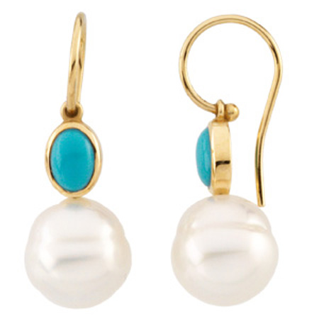 These are a enticing pair of south sea cultured pearl and genuine turquoise earrings. The earrings feature two baroque white cultured South Sea Pearls that are 5.0MM in diameter. The earrings also contain two natural oval blue green turquoise that is bezel set in solid 14K yellow gold. These earrings securely fit to your ear with a french wire.