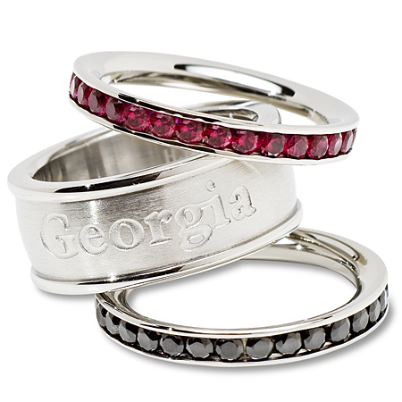 Showcase your Bulldogs allegiance with this University of Georgia Bulldogs cubic zirconia stacked ring set. This Bulldogs CZ ring set features style and quality rolled into one lovely accessory with red and black cubic zirconia team colored stones accenting to the stainless steel bands. It is officially licensed by the NCAA and comes in an official window gift box - ready to give. Support your favorite NCAA in style with this University of Georgia Bulldogs cubic zirconia stacked ring set.